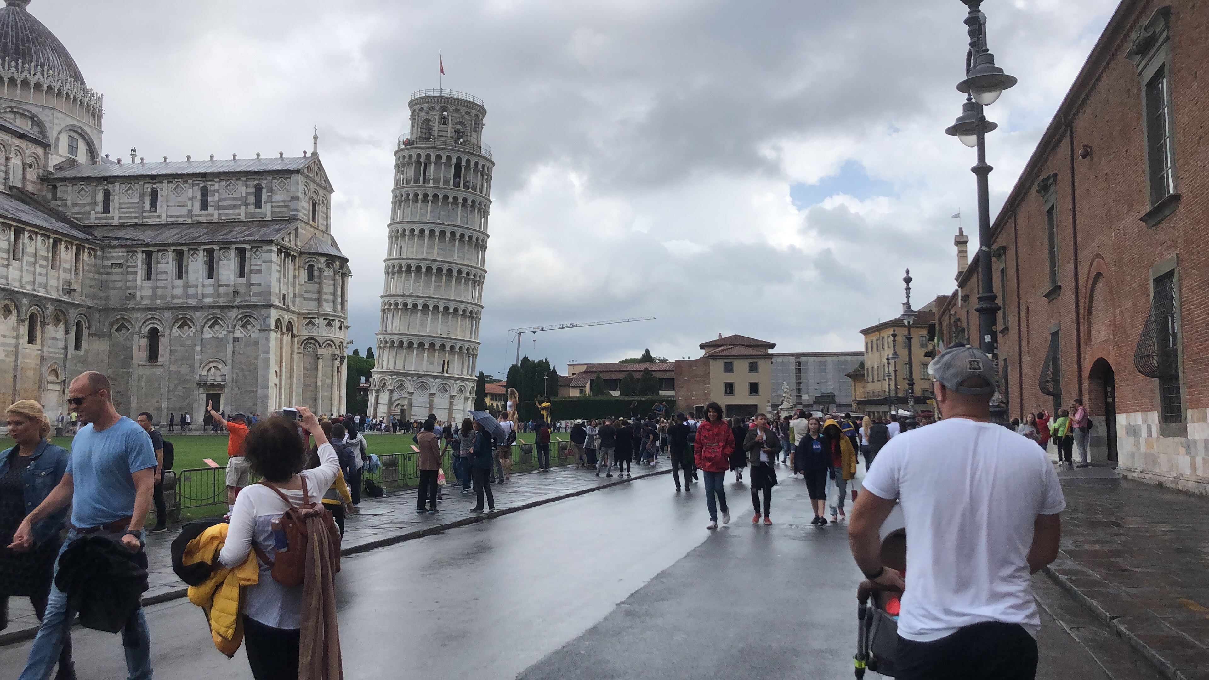 Schieflage neben dem Dom bei Regen und mit vielen Menschen