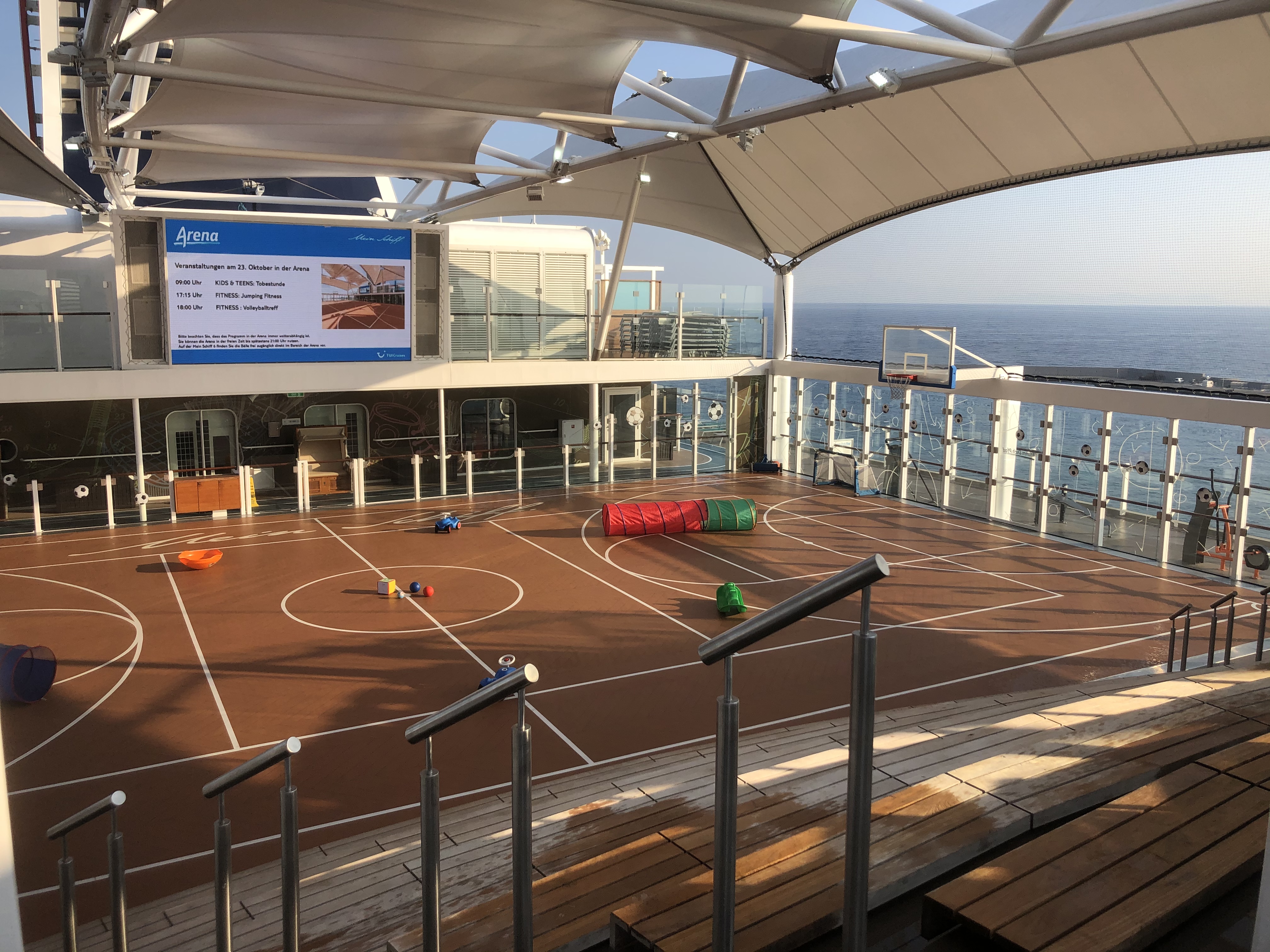 Eher zufällig kamen wir an der Sportarena des Schiffes vorbei, wo gerade die wenig-besuchte Tobestunde stattfand. MK hatte die Chance verschiedene Outdoor-Spielsachen im Schatten auszuprobieren. Das war sehr nett, wird aber wohl wenig angenommen.