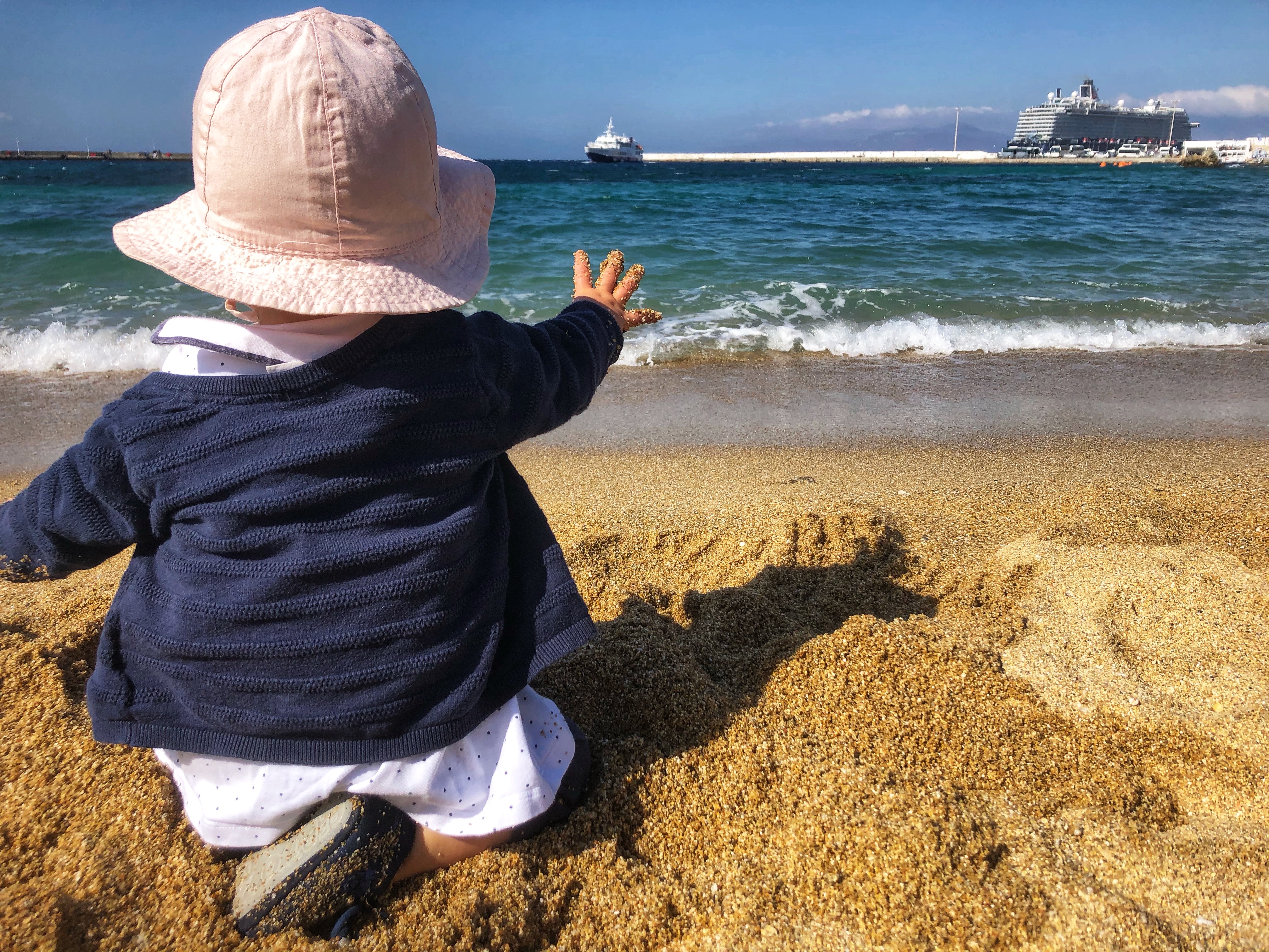 Der alte Hafen verfügt über einen kleinen, ordentlichen Strand, der MK und viele andere Kinder faszinierte. Leider war es viel zu windig, um zu baden, aber der Sand reichte zum Spielen aus!