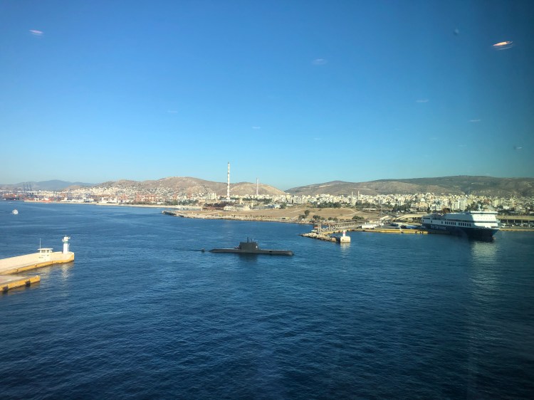 Wir liegen in Piräus (Hafen, Terminal B) – das ist eine Stadt direkt neben Athen, in der sich ein stark frequentierter Hafen mit Fährverkehr, Kreuzfahrtschiffen, Yachten und Booten befindet. Sogar ein U-Boot fuhr morgens an unserem Schiff vorbei.